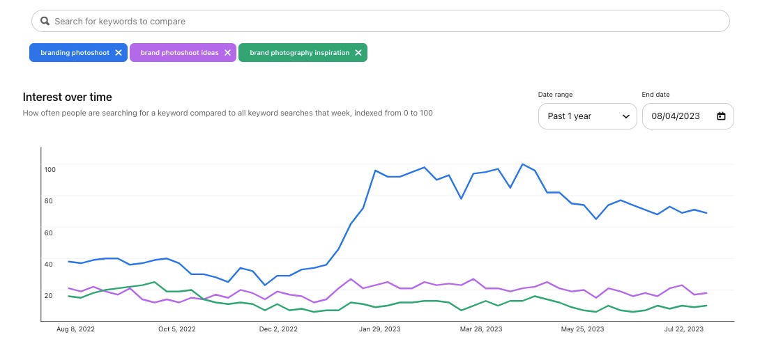 Now, there wasn't an option to directly compare “branding photoshoot” with “brand photoshoot” (an inherent limitation of Pinterest Trends), but just the fact that branding photoshoot is the most general option offered tells me that term is the one being searched most often.